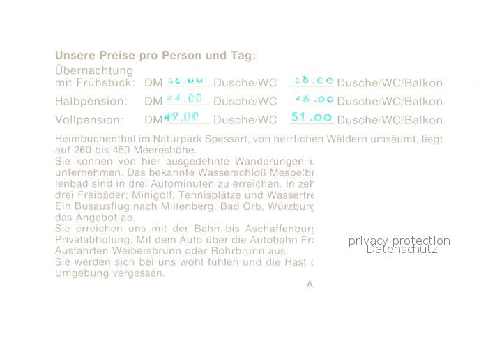73654509 Heimbuchenthal Gasthof Pension Sonnenblick Restaurant Garten Terrasse postalisch nicht gelaufen Werbekarte (keine Postkarte) Erhaltung siehe scans [FriedD77] KatCode: 11110009671127