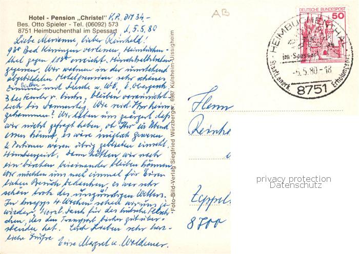 73866973 alte Postkarte Heimbuchenthal Hotel Pension Christel Gastraeume postalisch gelaufen Erhaltung siehe scans [WerneD78] KatCode: 11110009671127