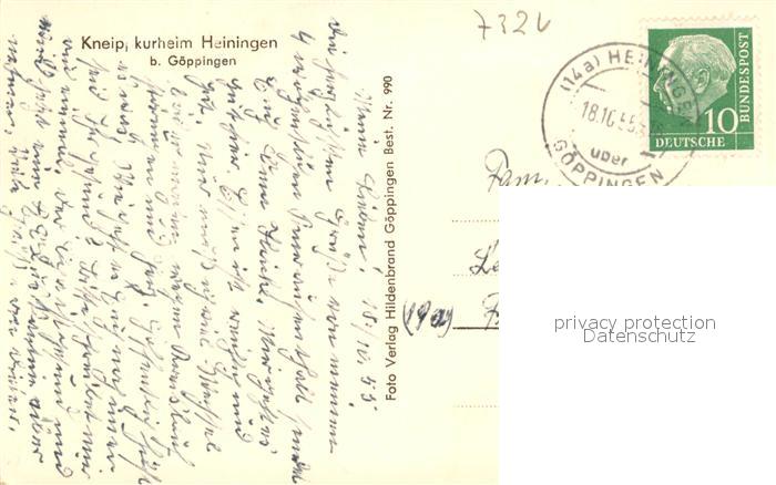 43277867 alte Postkarte Heiningen Goeppingen Kneippkurheim postalisch gelaufen Erhaltung siehe scans [FriedD77] KatCode: 11110008117030