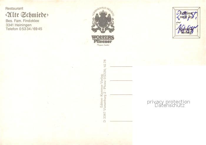 73210947 Heiningen Wolfenbuettel Klosterhaehnchen Restaurant Alte Schmiede Speisesaal Jagdzimmer postalisch nicht gelaufen Erhaltung siehe scans [WerneD78] KatCode: 11110003158019