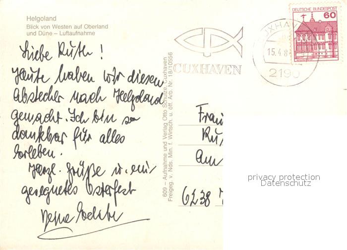 73203465 alte Postkarte Helgoland Blick von Westen auf Oberland und Duene Fliegeraufnahme postalisch gelaufen Erhaltung siehe scans [FriedD77] KatCode: 11110001056025