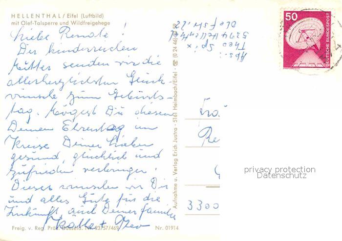 72781213 alte Postkarte Hellenthal Eifel mit Olef Talsperre und Wildfreigehege Fliegeraufnahme postalisch gelaufen Erhaltung siehe scans [FriedD77] KatCode: 11110005366020