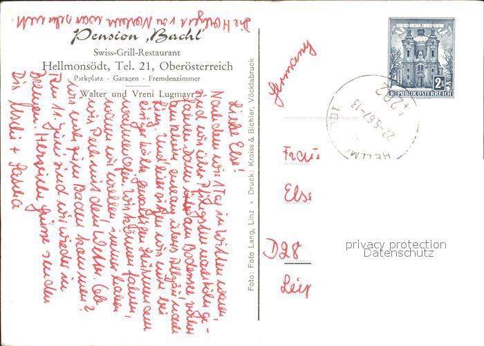 72371067 alte Postkarte Hellmonsoedt Pension Bachl Grill Restaurant postalisch gelaufen Erhaltung siehe scans KatCode: 11390312041611