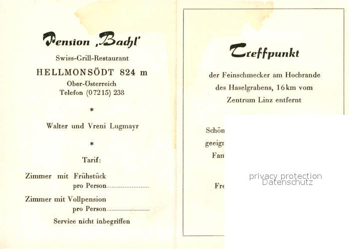 73591016 Hellmonsoedt Pension Swiss Grill Restaurant Bachl Panorama postalisch nicht gelaufen Werbekarte (keine Postkarte) Erhaltung siehe scans [KathaD81] KatCode: 11390312041611