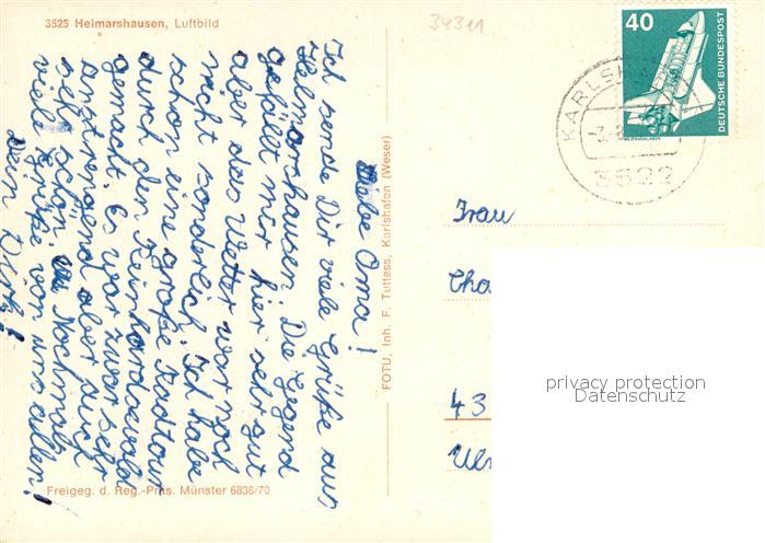 73667086 alte Postkarte Helmarshausen Fliegeraufnahme postalisch gelaufen Erhaltung siehe scans [WerneD78] KatCode: 11110006633002