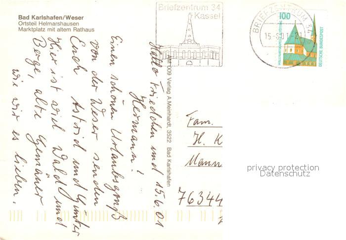 73214174 alte Postkarte Helmarshausen Marktplatz Brunnen Rathaus Fachwerkhaeuser postalisch gelaufen Erhaltung siehe scans [FriedD77] KatCode: 11110006633002