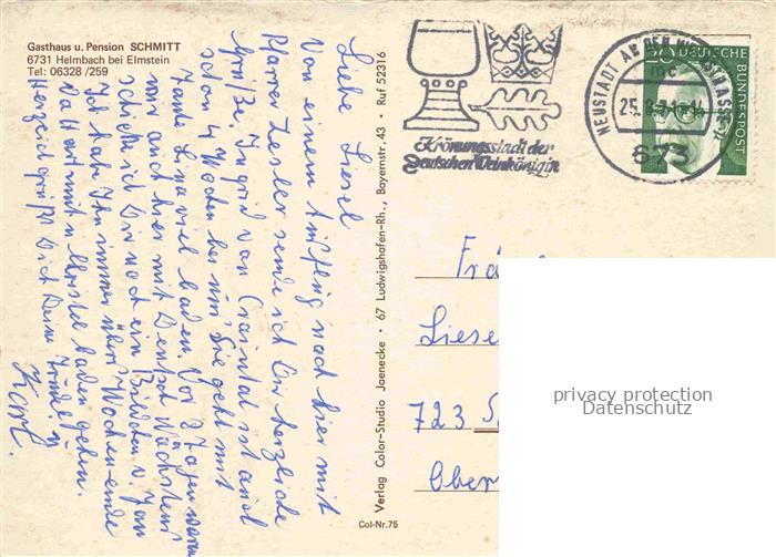 74046816 alte Postkarte Helmbach Elmstein Gasthaus Pension Schmitt Gastraeume Panorama postalisch gelaufen Erhaltung siehe scans [WerneD78] KatCode: 11110007332014