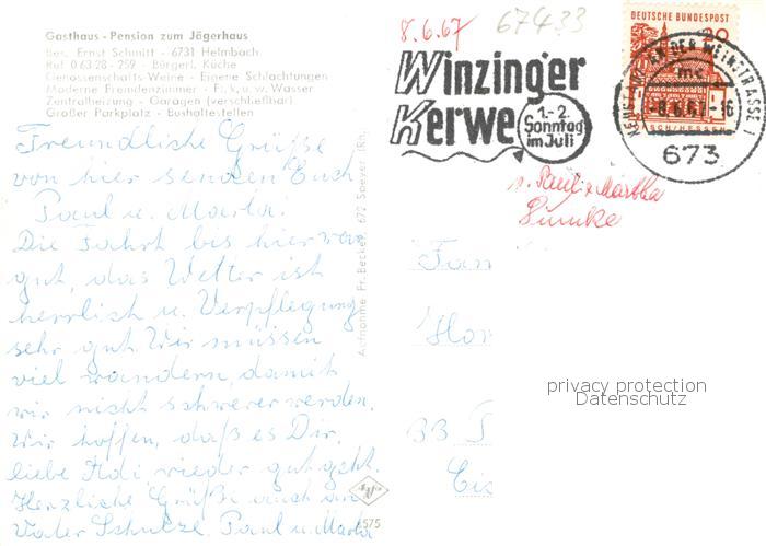 73867096 alte Postkarte Helmbach Elmstein Gasthaus Pension zum Jaegerhaus Hauptstrasse Burgruine Spangenberg postalisch gelaufen Erhaltung siehe scans [FriedD77] KatCode: 11110007332014