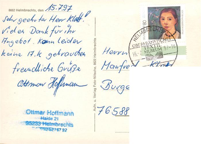 73941255 alte Postkarte Helmbrechts Oberfranken Ortszentrum Kirche Brunnen postalisch gelaufen Erhaltung siehe scans [FriedD77] KatCode: 11110009475136