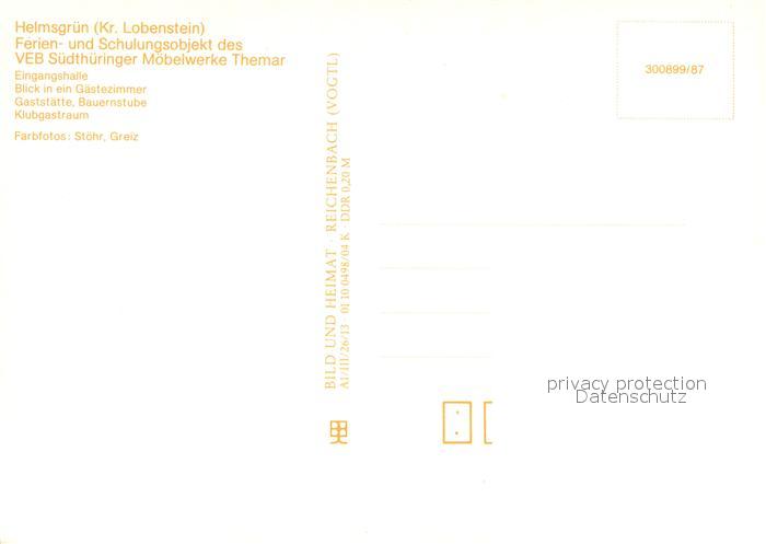 73722963 Helmsgruen Ferien und Schulungsobjekt des VEB Suedthueringer Moebelwerke Themar Eingangshalle Gaestezimmer Gaststaette Bauerntube Klubgastraum postalisch nicht gelaufen Erhaltung siehe scans [WerneD78] KatCode: 11110016075062