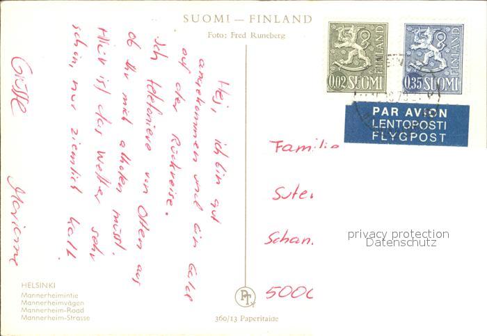 old postcard Helsinki Mannerheimintie postalisch gelaufen Erhaltung siehe scans