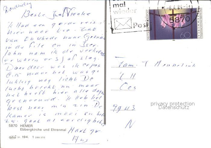 72579920 alte Postkarte Hemer Ebbergkirche und Ehrenmal postalisch gelaufen Erhaltung siehe scans [LiesaD40] KatCode: 11110005962016