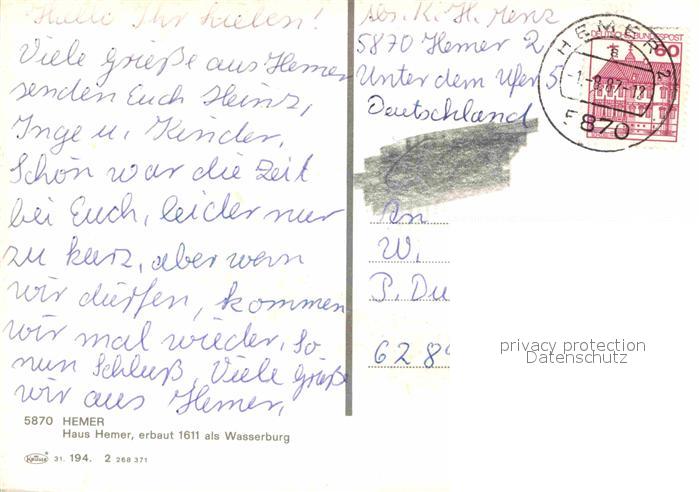 72654555 alte Postkarte Hemer Haus Hemer erbaut 1611 als Wasserburg postalisch gelaufen Erhaltung siehe scans [FriedD77] KatCode: 11110005962016