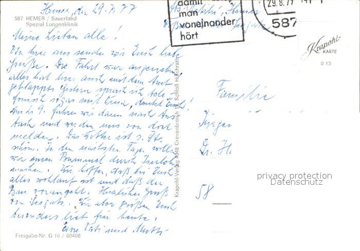 72022108 alte Postkarte Hemer Spezial Lungenklinik Fliegeraufnahme postalisch gelaufen Erhaltung siehe scans KatCode: 11110005962016