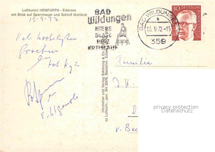 72655876 alte Postkarte Hemfurth-Edersee Fliegeraufnahme mit Sperrmauer und Schloss-Waldeck postalisch gelaufen Erhaltung siehe scans [LiesaD40] KatCode: 11110006635009