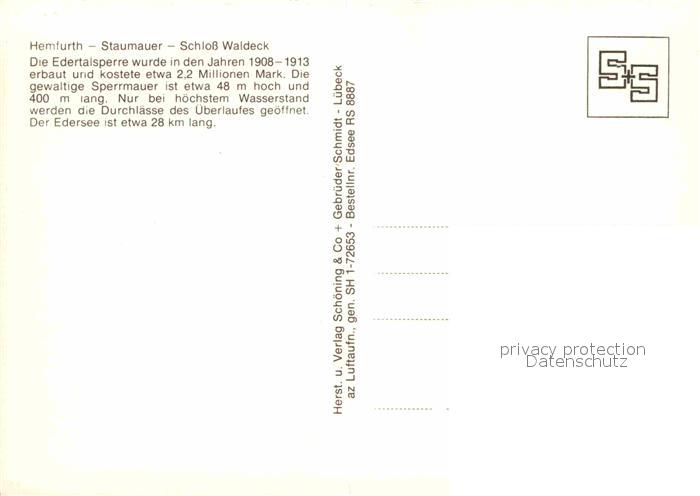72905565 Hemfurth-Edersee Fliegeraufnahme Staumauer Schloss-Waldeck postalisch nicht gelaufen Erhaltung siehe scans [LiesaD40] KatCode: 11110006635009