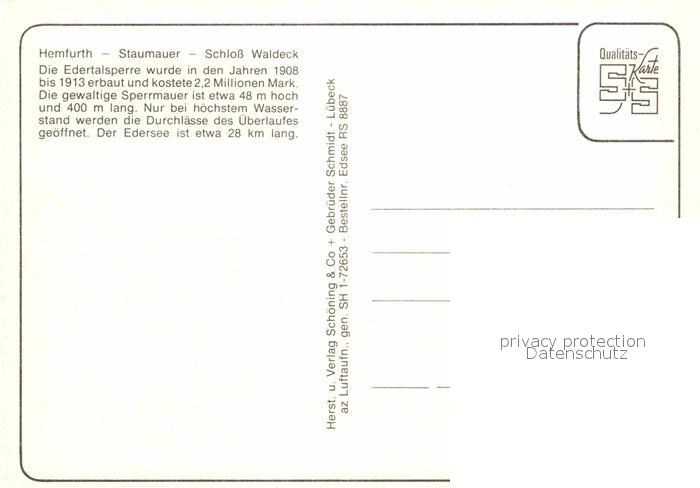 72701164 Hemfurth-Edersee Staumauer Schloss Waldeck postalisch nicht gelaufen Erhaltung siehe scans [KathaD79] KatCode: 11110006635009