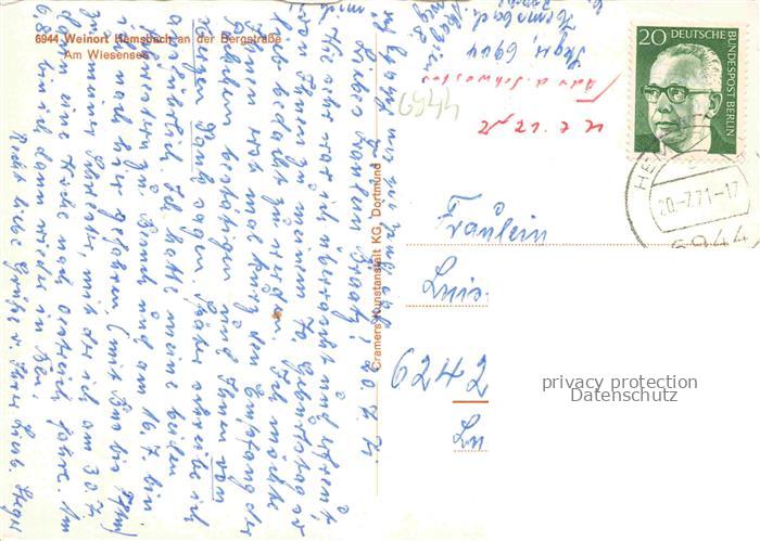 74048218 alte Postkarte Hemsbach Bergstrasse Badestrand am Wiesensee Luftaufnahme postalisch gelaufen Erhaltung siehe scans [FriedD77] KatCode: 11110008226031