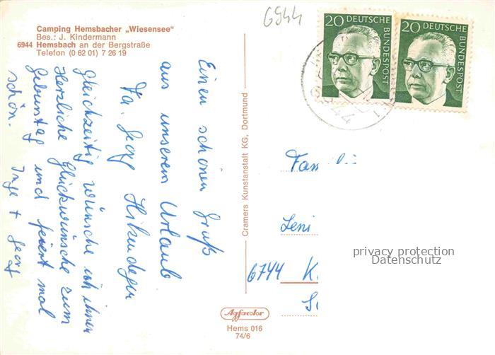 74048211 alte Postkarte Hemsbach Bergstrasse Camping Hemsbacher Wiesensee Badestrand Tennis Minigolf postalisch gelaufen Erhaltung siehe scans [FriedD77] KatCode: 11110008226031