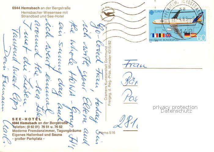 73323071 alte Postkarte Hemsbach Bergstrasse Hemsbacher Wiesensee mit Strandbad und Seehotel Fliegeraufnahme postalisch gelaufen Erhaltung siehe scans [FriedD77] KatCode: 11110008226031