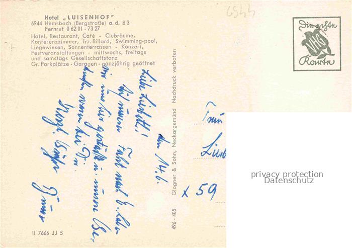74048167 Hemsbach Bergstrasse Hotel Luisenhof Terrasse Swimming Pool postalisch nicht gelaufen Erhaltung siehe scans [FriedD77] KatCode: 11110008226031