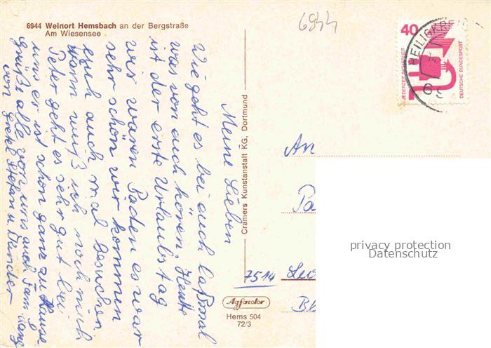 74048111 alte Postkarte Hemsbach Bergstrasse Luftaufnahme Weinort Wiesensee Bootsanleger Badestrand postalisch gelaufen Erhaltung siehe scans [FriedD77] KatCode: 11110008226031
