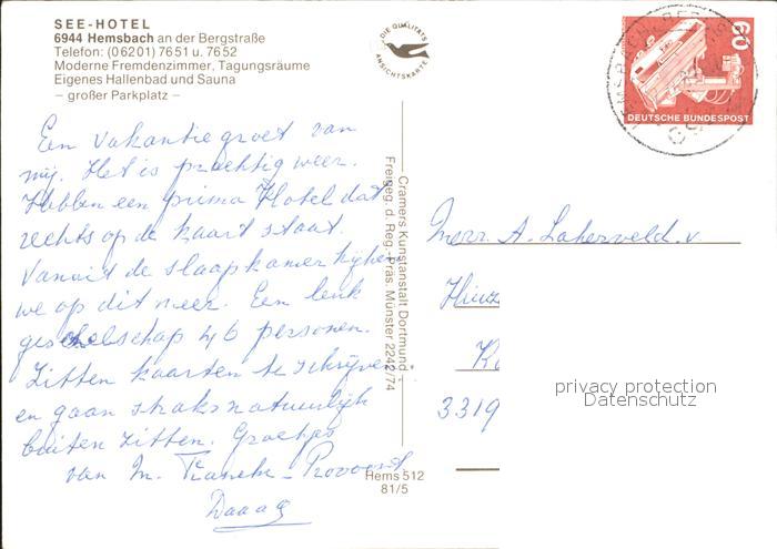 72223487 alte Postkarte Hemsbach Bergstrasse See-Hotel postalisch gelaufen Erhaltung siehe scans KatCode: 11110008226031