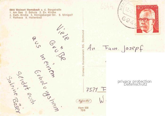 74048070 alte Postkarte Hemsbach Bergstrasse Stadtpanorama Baumbluete Badestrand Hotel Hallenbad Kirche Minigolf postalisch gelaufen Erhaltung siehe scans [FriedD77] KatCode: 11110008226031