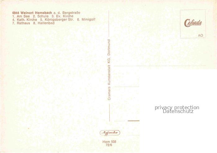 74048173 Hemsbach Bergstrasse Stadtpanorama Baumbluete Freibad Schule Kirche Strassenpartie Minigolf Rathaus Hallenbad postalisch nicht gelaufen Erhaltung siehe scans [FriedD77] KatCode: 11110008226031