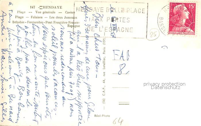 13529814 carte postale Hendaye Pyrenees Atlantiques Frontiere Franco Espagnole postalisch gelaufen Erhaltung siehe scans [LiesaD40] KatCode: 11170064164260
