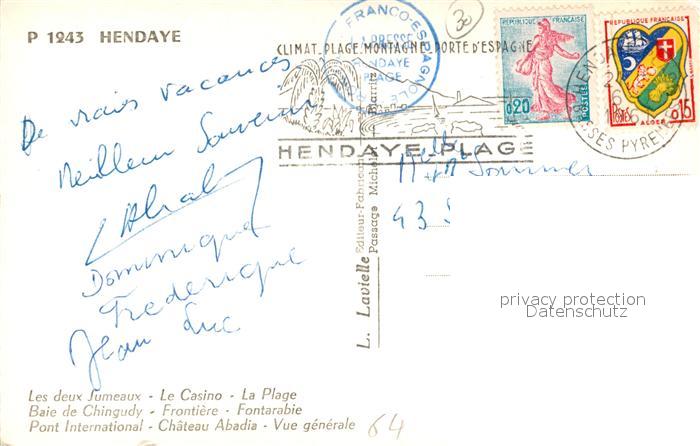 13529819 carte postale Hendaye Pyrenees Atlantiques Plage Frontiere Franco-Espagnole postalisch gelaufen Erhaltung siehe scans [LiesaD40] KatCode: 11170064164260
