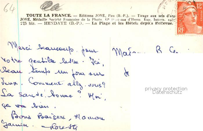 13545292 carte postale Hendaye Pyrenees Atlantiques Plage Hotels Bellevue postalisch gelaufen Erhaltung siehe scans [KathaD81] KatCode: 11170064164260
