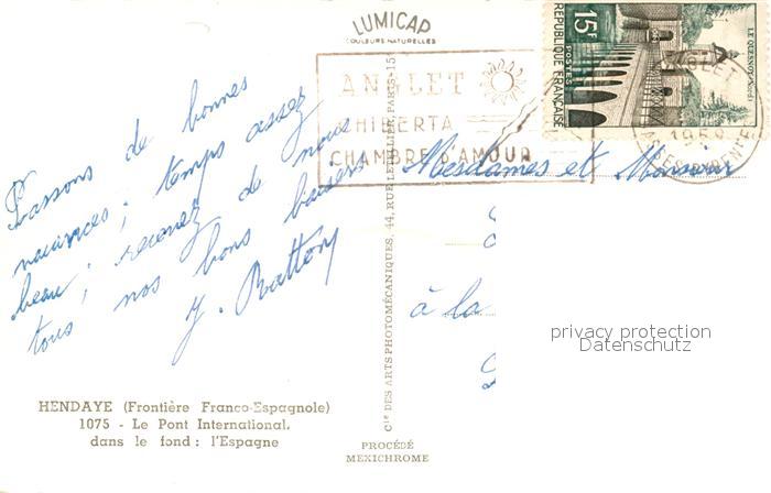 13535575 carte postale Hendaye Pyrenees Atlantiques Pont International Frontière Franco Espagnole postalisch gelaufen Erhaltung siehe scans [FriedD77] KatCode: 11170064164260