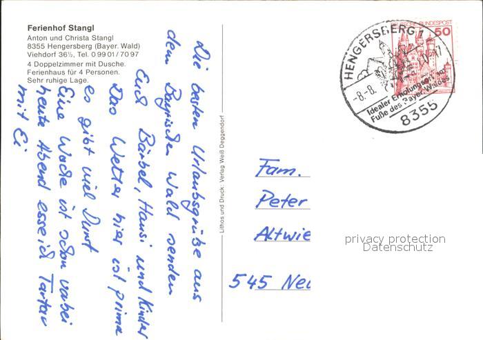 72000076 alte Postkarte Hengersberg Ferienhof Stangl postalisch gelaufen Erhaltung siehe scans KatCode: 11110009271125