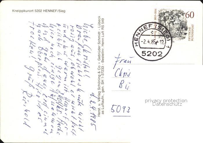 72426024 alte Postkarte Hennef Sieg Kneippkurort Fliegeraufnahme postalisch gelaufen Erhaltung siehe scans KatCode: 11110005382020