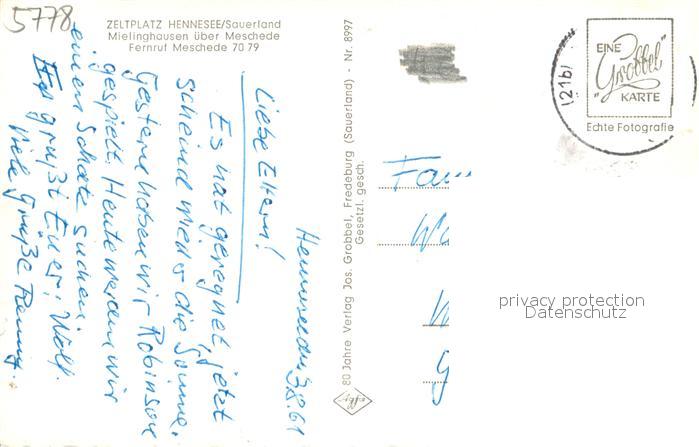 73705717 alte Postkarte Hennesee Meschede Zeltplatz postalisch gelaufen Erhaltung siehe scans [WerneD78] KatCode: 11110005958032