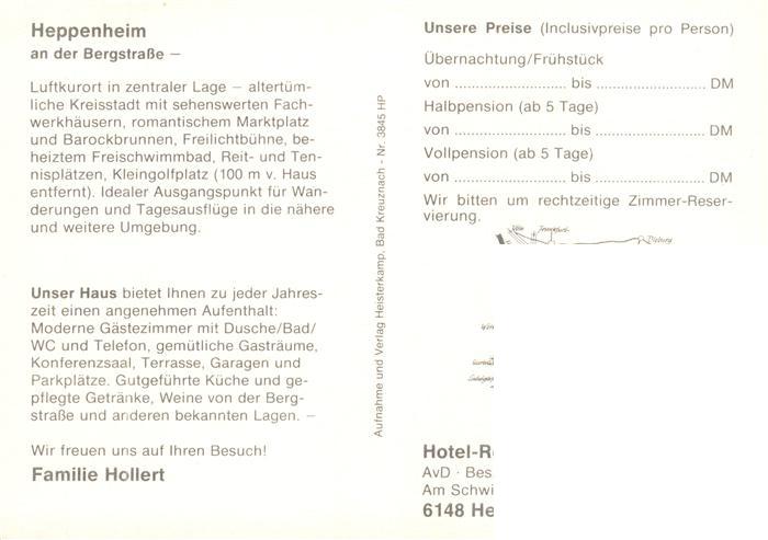73878829 Heppenheim Bergstrasse Hotel Restaurant Schlossberg Gastraeume Zimmer postalisch nicht gelaufen Werbekarte (keine Postkarte) Erhaltung siehe scans [WerneD78] KatCode: 11110006431011