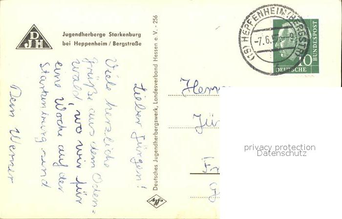72591689 alte Postkarte Heppenheim Bergstrasse Jugendherberge Starkenburg postalisch gelaufen Erhaltung siehe scans [WerneD78] KatCode: 11110006431011