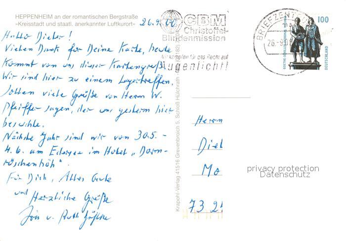 73228280 alte Postkarte Heppenheim Bergstrasse Kurfuerstlicher Amtshof Jokus Brunnen Rathaus Marktplatz Stadtbild mit Dom Starkenburg Fliegeraufnahme postalisch gelaufen Erhaltung siehe scans [FriedD77] KatCode: 11110006431011