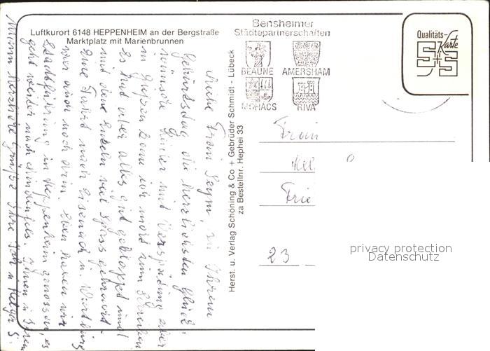 72409303 alte Postkarte Heppenheim Bergstrasse Marktplatz mit Marienbrunnen Fachwerk postalisch gelaufen Erhaltung siehe scans KatCode: 11110006431011