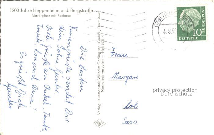 72096995 alte Postkarte Heppenheim Bergstrasse Marktplatz mit Rathaus Brunnen postalisch gelaufen Erhaltung siehe scans KatCode: 11110006431011