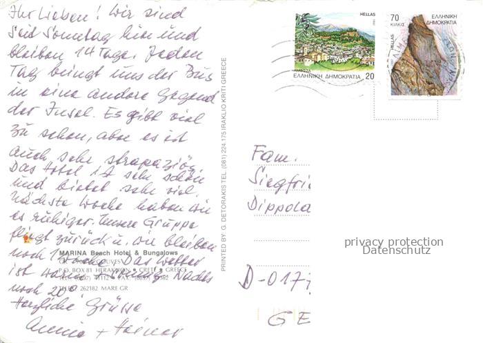 74005667 old postcard Heraklion Herakleion Heraclio Iraclio Crete Greece Marina Beach Hotel und Bungalows Strandpartie postalisch gelaufen Erhaltung siehe scans [WerneD78] KatCode: 11190
