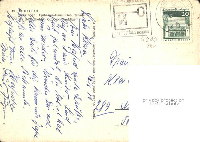 72603468 alte Postkarte Herford Fruehherrenhaus Geburtshaus von Otto von Weddigen Markt Poeppelmann Haus Kirche postalisch gelaufen Erhaltung siehe scans [FriedD77] KatCode: 11110005758012