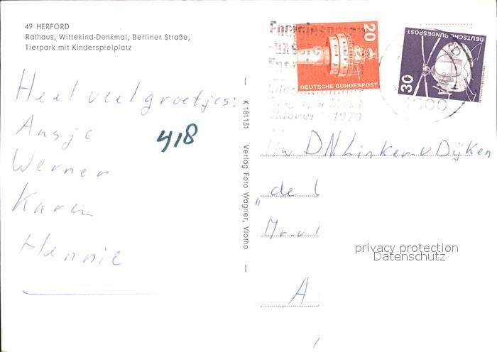 72310203 alte Postkarte Herford Rathaus Wittekind-Denkmal Berliner Strasse Tierpark postalisch gelaufen Erhaltung siehe scans KatCode: 11110005758012