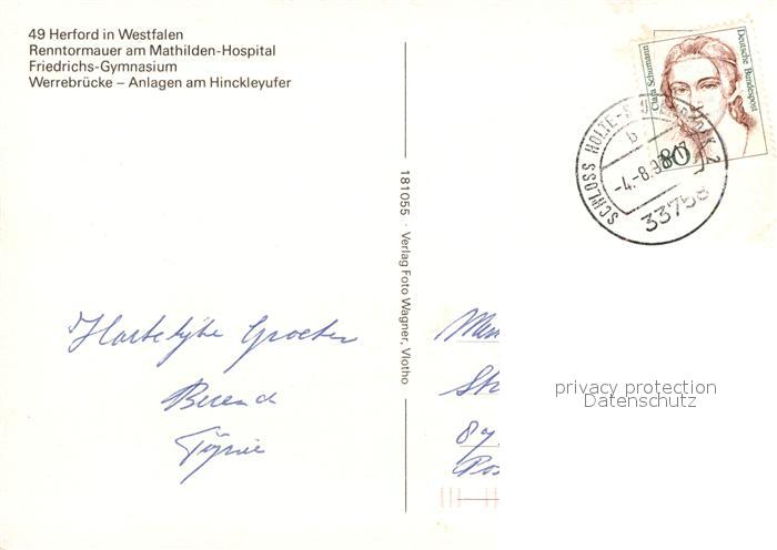 73311821 alte Postkarte Herford Renntormauer Mathilden Hospital Friedrichsgymnasium Werrebruecke postalisch gelaufen Erhaltung siehe scans [KathaD81] KatCode: 11110005758012