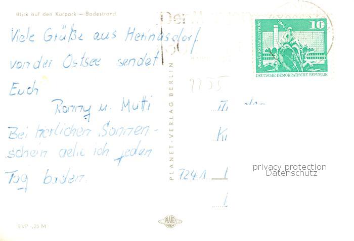 73863635 alte Postkarte Heringsdorf Ostseebad Usedom Blick auf den Kurpark mit Badestrand postalisch gelaufen Erhaltung siehe scans [WerneD78] KatCode: 11110013059112