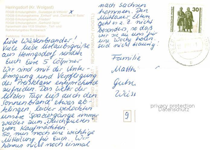 72654377 alte Postkarte Heringsdorf Ostseebad Usedom FDGB Erholungsheime Guiseppe di Vittorio Einheit Camara Balia Frieden Gerhard Opitz Ferienheim Rodewisch postalisch gelaufen Erhaltung siehe scans [WerneD78] KatCode: 11110013059112