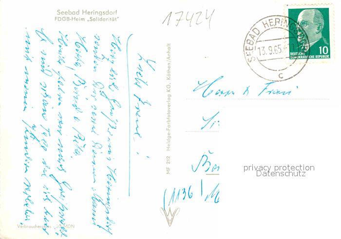 72709902 alte Postkarte Heringsdorf Ostseebad Usedom FDGB Heim Solidaritaet postalisch gelaufen Erhaltung siehe scans [FriedD77] KatCode: 11110013059112