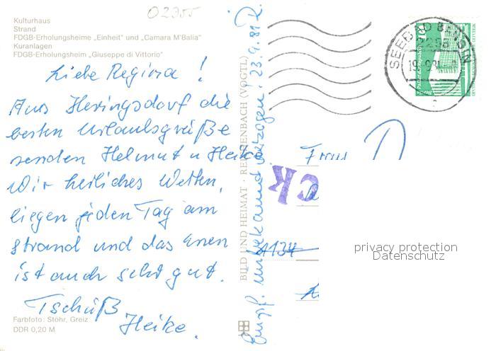 73059155 alte Postkarte Heringsdorf Ostseebad Usedom Kulturhaus Strand FDGB Erholungsheime Einheit und Camara M Balia und Giuseppe di Vittorio postalisch gelaufen Erhaltung siehe scans [WerneD78] KatCode: 11110013059112