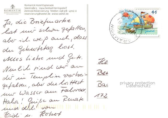 73755042 alte Postkarte Heringsdorf Ostseebad Usedom Romantik Hotel Esplanade postalisch gelaufen Erhaltung siehe scans [FriedD77] KatCode: 11110013059112